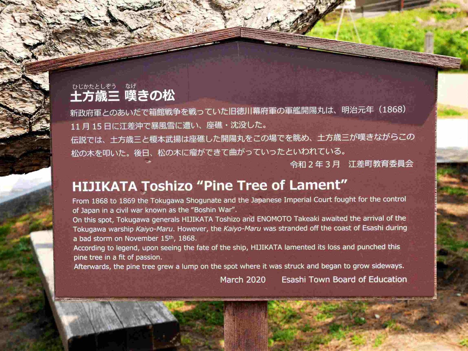 伝説では、土方歳三と榎本武揚は座礁した開陽丸をこの場で眺め、土方歳三が嘆きながらこの松の木を叩いた。
